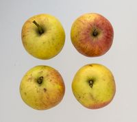 Den grønne Grundfarve går over til gulliggrøn!, gult og gulhvidt. Solsiden med rød til karminrød Dækfarve, der er fordelt i Striber, små Prikker og uregelmæssig Marmorering. |