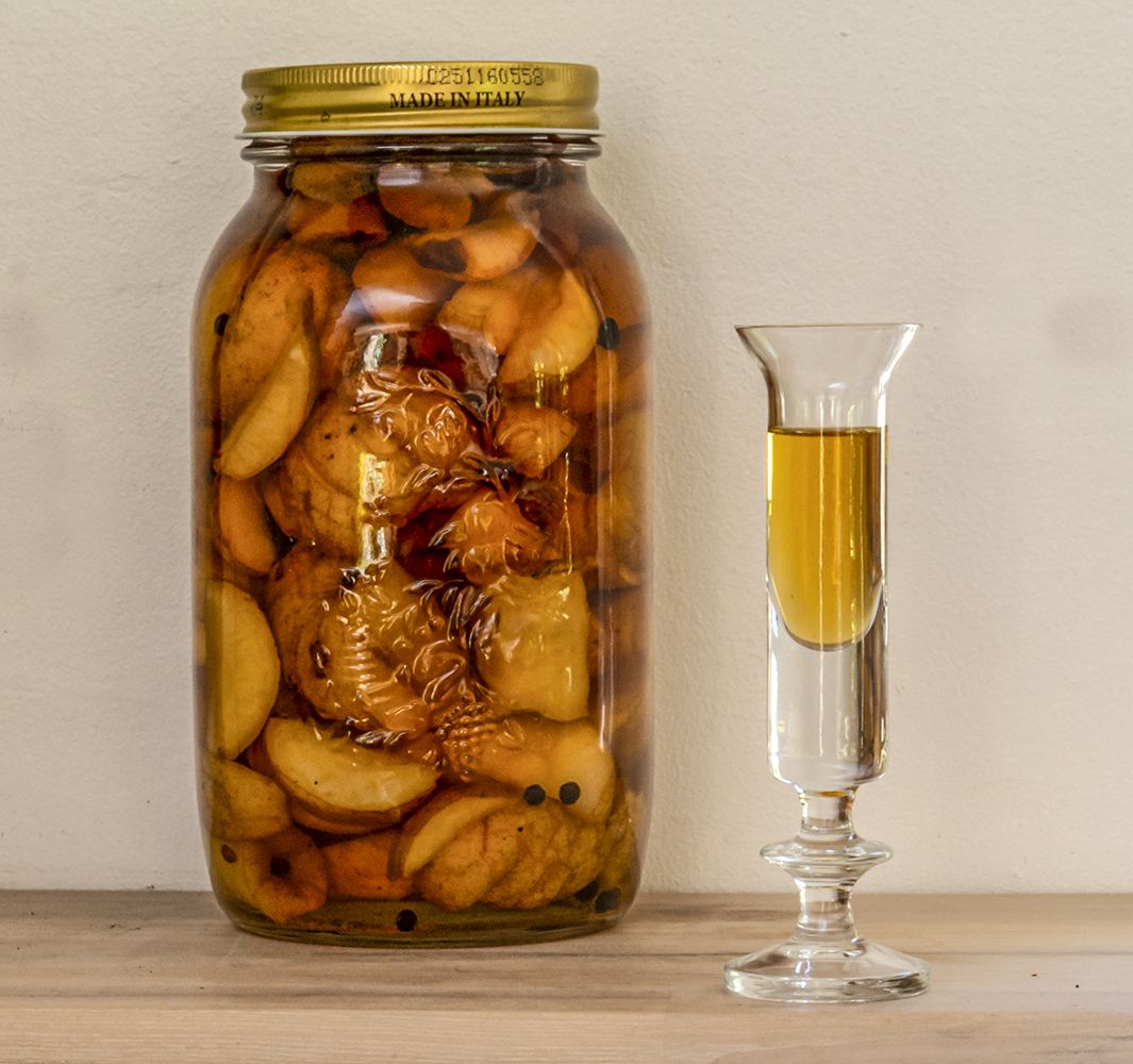 Æblesnaps opskrift 3, snaps på æbler, slåen, rosiner og peberkorn
