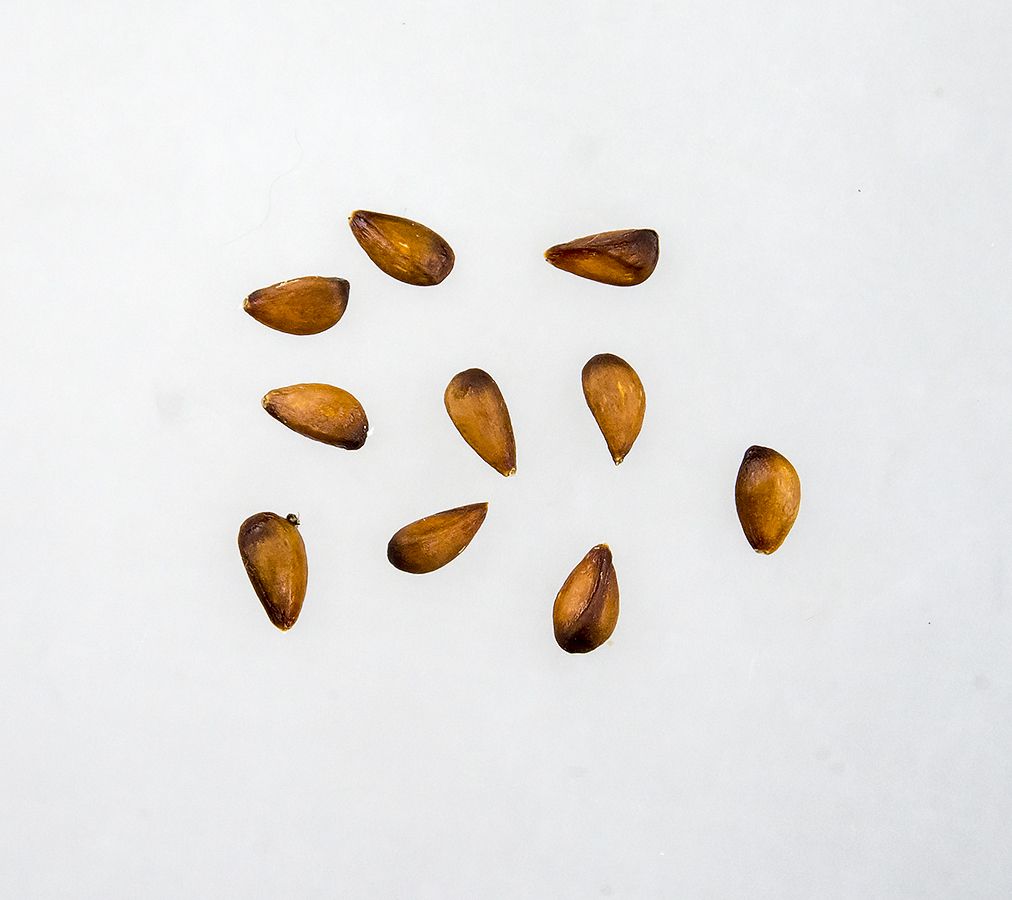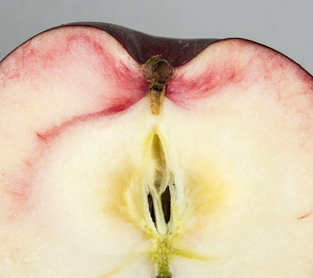 The fruit is medium in size with bright pink base color covered with dark burgundy. The flesh is white with pink splashes. The apple is sweet, firm and crisp and is a very fine eating apple.