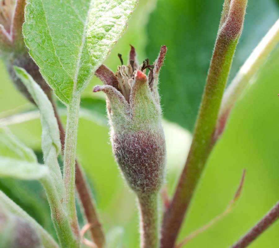 Blomsten er befrugtet og frugtknuden begynder at tage form af et æble